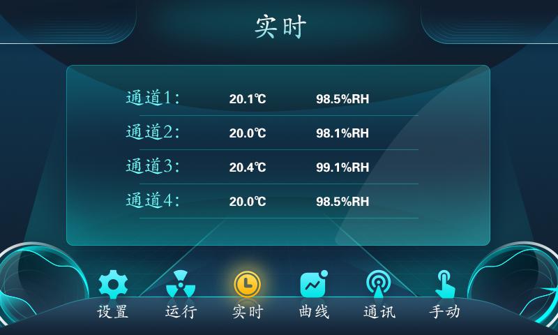 运行界面为主显示界面,温湿度值为平均值,可同时接入4个无线传感器。