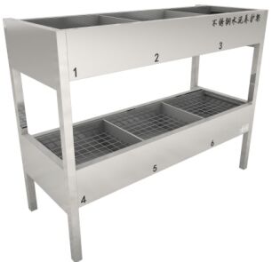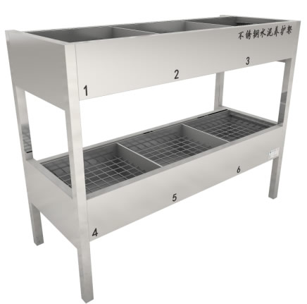 水槽架外形客户可根据实际需求选择,标准为两层六格,每格20组(3个为一组),共120组。另有三层九格,每格20组,共180组。