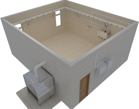 5 、控温机组:控温设备置于标养室外面,养护室内部留进风口 和回风口,内部使用 PVC 带孔管道布置一圈,一方面保证设备不受潮 湿环境影响,另一方面保证标养室内温度的均匀度,控温设备的选择也需尽量使用不锈钢等防水防腐材质的设备。
